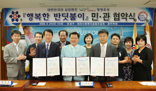 유성구는 24일 중회의실에서 진동규 유성구청장과 김정렬 대전문학원장, 박용규 경성입시학원장과 정순훈 대전사회복지공동모금회장 등 10여명이 참석한 가운데 구관 내 저소득층 자녀들의 무료 수강지원을 위한 ‘행복한 반딧불이’ 민・관 협약을 체결하고 지역사회 복지증진에 상호 협력해 나가기로 했다.