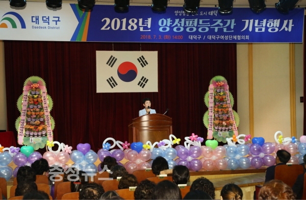 대전 대덕구(구청장 박정현)가 3일 대덕구평생학습센터 대강당에서 양성평등주간(7.1.~7.7.)을 맞이해 대덕구여성단체협의회(회장 이영신) 주관으로 ‘양성평등 선도 도시 「대덕」’이라는 주제를 가지고 양성평등주간 기념행사를 개최했다.
