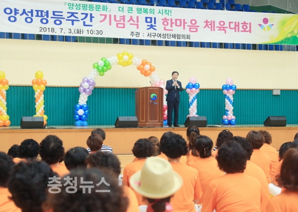 대전 서구(구청장 장종태)는 양성평등주간을 맞아 3일 도솔다목적체육관에서 장종태 서구청장을 비롯해 국회의원, 시․구의원, 여성단체 등 450여 명이 참석한 가운데 ‘양성평등문화, 더 큰 행복의 시작!’을 주제로 기념행사를 개최했다고 밝혔다.