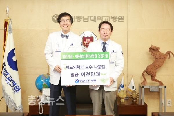 충남대학교병원(원장 송민호)은 前세종충남대학교병원 건립단장인 비뇨의학과 나용길 교수로 부터 발전기금 2천만원(세종충남대학교병원 건립기금, 비뇨의학과 발전기금 각 1천만원)을 기부받았다.
