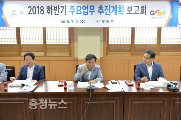 충남 부여군은 11일 군청 브리핑실에서 박정현 군수를 비롯한 전 부서장이 참석한 가운데 ‘2018 하반기 주요업무 추진계획 보고회’를 개최했다.
