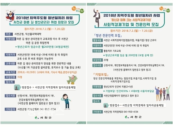 신청방법은 신분증을 지참하고 해당 사업의 신청서와 첨부 서류를 오는 20일 금요일까지 서천군청 지역경제과 일자리공동체팀에 제출하면 된다.