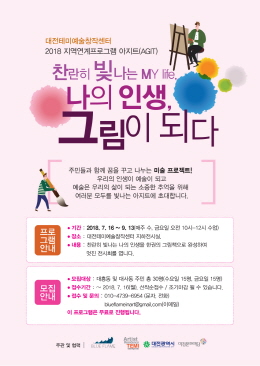 2018년도 아지트(AGIT)는 지난 5월 공모를 통해 선정된 운영단체 블루프레임 인 아트(대표 박순용)의 “찬란히 빛나는 My Life, 나의 인생 그림이 되다”라는 테마로, 지역 주민들이 지난 인생을 돌아보는 시간을 갖고, 예술가들과 함께 인생의 에피소드를 그림으로 표현하는 형태의 교육 프로그램으로 운영된다.