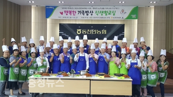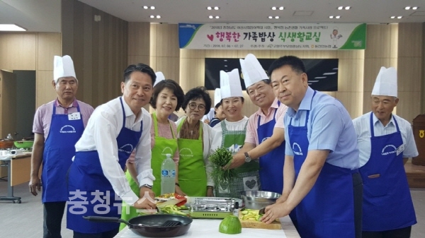 조소행 충남농협 본부장과 조덕현 동천안농협 조합장, 조두식 농협천안시지부장 등이 남성 어르신들과 함께 요리에 참여해 행복한 가족밥상 차리기에 앞장설 것을 다짐했다.