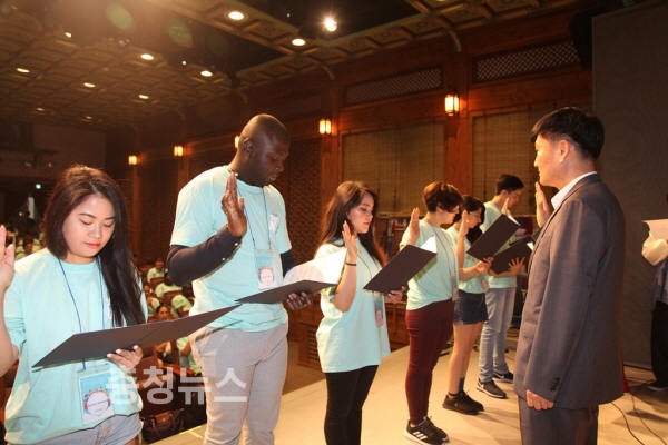 임명장 수여 후 선서를 하는 서포터즈와 aT 백진석 식품수출이사