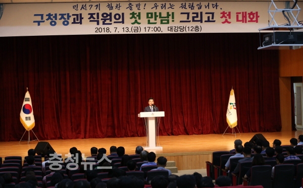 대전 동구(구청장 황인호)는 지난 13일 구청 12층 대강당에서 직원 350여 명이 모인가운데 구청장-직원과의 소통 공감을 위한 첫 만남 행사를 가졌다.