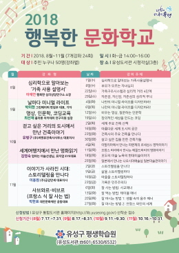 대전 유성구 평생학습원(원장 이하경)은 8월부터 11월까지 유성도서관에서 심리, 명상, 교양, 예술분야의 명사를 초청, ‘2018 행복한 문화학교’를 운영한다고 16일 밝혔다.