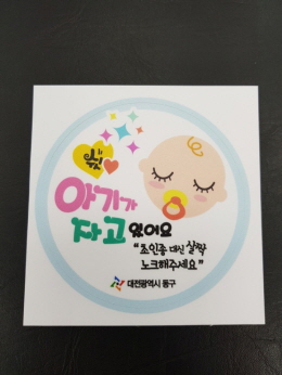 대전 동구(구청장 황인호)는 신생아의 숙면에 도움을 주고 이웃들의 배려를 유도하기 위해 출산가정에 ‘아기가 자고 있어요’ 스티커를 배부한다고 16일 밝혔다.