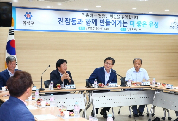 16일 오후 진잠동을 초도방문한 정용래 대전 유성구청장(오른쪽에서 두 번째)이 진잠동 직능단체장들과 대화를 나누고 있다.