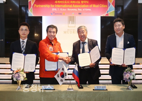 또 15일에는 김 시장과 아우쉬프 알렉산더 러시아 부리야트공화국 울란우데 정부대표(부시장) 와 피터 에르타노프 부리야트 상공회의소 회장 등 러시아측 관계자와 최범수 ㈜바이칼 네이처 대표이사, 안일용 시크릿다이렉트코리아(주) 총괄이사, 홍현욱 (유)바이칼 크리스탈 대표이사 등 기업 관계자 등이 참석한 가운데 세계머드도시연합 공식 출범을 위한 세계머드도시 파트너십 협약식을 가졌다.