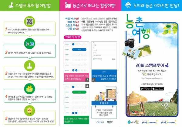 ‘농촌여행 스탬프투어’는 농촌체험 프로그램을 운영하는 농촌체험휴양마을, 관광농원, 농촌융복합산업 인증기업 등을 방문해 체험활동을 한 뒤 모바일 앱의 QR코드 인증을 통해 스탬프를 찍으면, 농산물 등 푸짐한 상품을 받을 수 있는 프로그램이다.