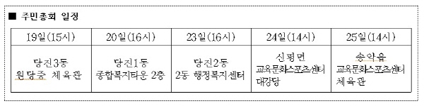 충남 당진시는 주민 중심의 풀뿌리 주민자치 신호탄이 될 읍‧면‧동 주민총회를 19일 당진3동을 시작으로 25일까지 지역 내 5개 읍‧면‧동에서 진행된다고 밝혔다.