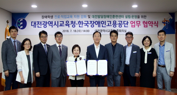 대전시교육청(교육감 설동호)은 18일 시교육청 중회의실에서 한국장애인고용공단(이사장 조종란)과 대전발달장애인훈련센터 설립·운영 관련 업무협약을 체결했다.