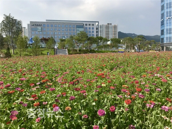 충남 예산군 신청사 일원에 형형색색 만개한 백일홍들이 청사를 방문하는 군민들의 눈을 즐겁게 하고 있다. 예산군은 지난 5월 꽃양귀비 꽃밭 조성에 이어 유휴지(예산리 789)에 1800㎡규모의 백일홍 꽃밭을 조성했다.