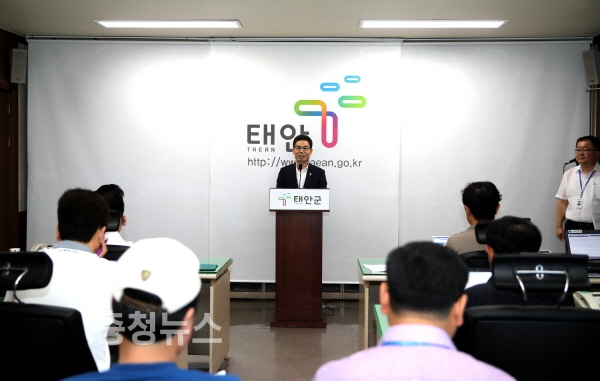 충남 태안군은 19일 군청 브리핑실에서 기획감사실 정례브리핑을 갖고, 민선7기 성과 창출을 위해 하반기 △광개토 대사업의 조기 가시화를 위한 기획·조정 역할 강화 △핵심정책 수요조사 실시 △민선7기 군정을 견인할 ‘역점과제’ 선정·관리 △지역개발을 가로막는 ‘행정규제’ 완화 등에 앞장서겠다고 밝혔다.