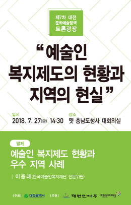 대전문화재단은 오는 27일 옛 충남도청사 2층 대회의실에서 제7차 대전문화예술정책 토론광장을 개최한다. 이번 토론광장에서는 대전문화재단과 대전민예총이 공동주관해 ‘예술인 복지제도의 현황과 지역의 현실’을 주제로 진행된다.