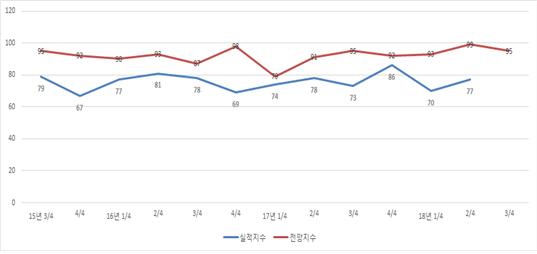 이번 조사에는 지난 분기(99) 대비 4포인트 하락, 95를 기록하며 기준치(100)를 넘기지 못하면서 경기 회복에 대한 기대감이 다소 낮아진 것으로 나타났다.