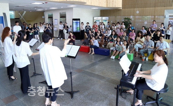 이번 행사는 다음달 3일부터 개최하는 대전지역 대표 예술축제인 제18회 대전국제음악제의 시그니처 프로그램으로 유성구와 협력해 4인조 성악팀 ‘보이스포유’의 성악 공연으로 진행됐다.