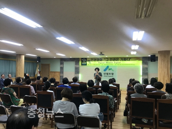 충남 예산군아동‧여성안전지역연대와 예산성폭력상담소(소장 이경옥)는 23일 예산군 산림조합 회의실 3층에서 여성인권영화 <그 인권은 가짜다(Equal Means Equal)>를 상영했다.