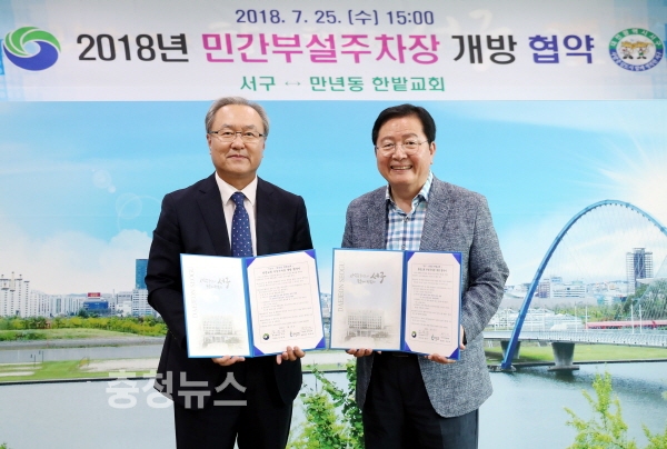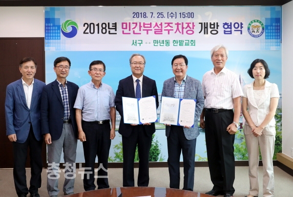 대전 서구(구청장 장종태)는 도심 주차공간 확보를 위해 25일 구청 다목적실에서 한밭교회(만년동)와 ‘민간부설주차장 개방 협약’을 체결했다고 밝혔다.