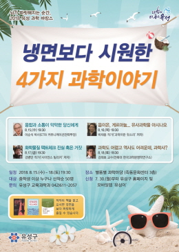 '냉면보다 시원한 4가지 과학이야기’라는 제목으로 펼쳐지는 이번 과학바캉스는 한국전자통신연구원 이순석 부장의 ‘융합과 소통’을 시작으로 과학커뮤니케이터 박재용 작가의 ‘유사과학’, 김병민 작가의 ‘화학물질 팩트체크’, 전북대 김태호 교수의 ‘과학역사’ 강연으로 이어진다.