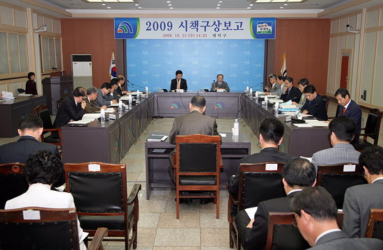 대전시 대덕구(구청장 정용기)가 15일 구청 중회의실에서 주민대표와 행정, 사회복지, 도시개발 등 각 분야별 전문가와 공무원등 200여명이 참여한 가운데 ‘2009 시책구상 보고회’를 가졌다. 이날 보고회에서는 행정서비스 향상과 주민참여 활성화, 살기 좋은 지역만들기를 위한 참신한 시책 등이 제안됐다.
