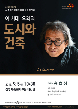 이번 특별강연은 이로재의 대표이자 국가건축정책위원회 위원장을 맡고 있는 승효상 건축가가 ‘이 시대 우리의 도시와 건축’을 주제로 신도시에서 살고있는 세종시민에게 도시와 건축의 의미에 대한 견해를 90분 동안 들려줄 예정이다.