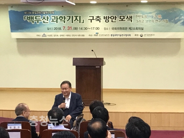 이날 국회의원회관에서 같은당 김진표, 김태년, 안민석, 이종걸 의원과 함께 ‘남북 과학기술 협력 거점의 백두산 과학기지 구축 방안 모색’을 주제로 세미나를 공동으로 주최했다.