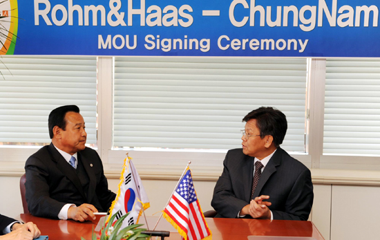 이완구 충남지사는 18일 필라델피아에서 백이현 롬앤하스 사장과 OLED 생산 및 연구개발시설 확충을 위한 투자협약서(MOU)에 서명했다.이에 따라 롬앤하스는 올해부터 2011년까지 천안시 백석동 외국인투자지역 내 9천68㎡에 4천만달러를 투입해 OLED 생산라인을 건립하고 OLED 분야의 연구개발시설을 세우게 된다.