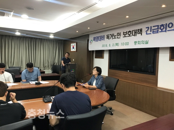 충남 천안시는 2일 시청 중회의실에서 박미숙 복지문화국장 주재로 독거노인 폭염피해 예방 긴급 대책회의를 개최했다.