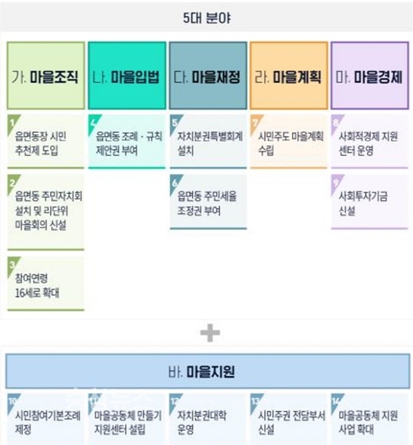그러면서 “시장과 시가 가지고 있던 마을조직‧마을입법‧마을재정‧마을계획‧마을경제 등 5개 분야 및 시의 지원체계 운영을 포함하여 ‘5+1 분야’ 14개 과제를 적극 추진할 계획”이라고 말했다.