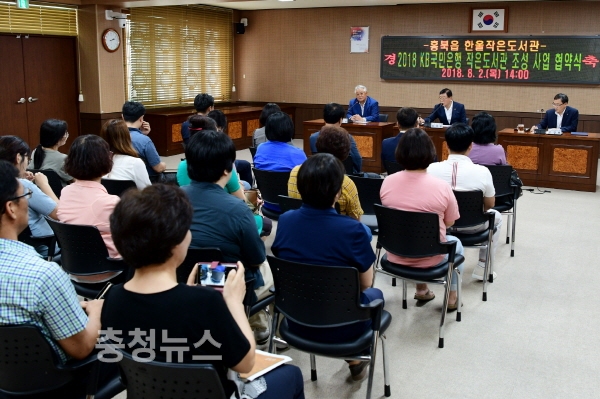 충남 홍성군은 지난 2일 군청 회의실에서 사)작은도서관만드는사람들, KB국민은행과 함께 2018 작은도서관 조성사업 협약식을 가지며 홍북읍 LH스타힐스 아동통합지원센터 내에 ‘한울 작은도서관’을 건립하겠다고 밝혔다.