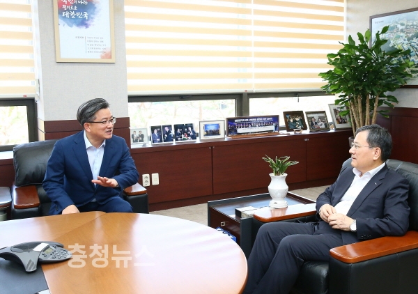 지난 2일 정용래 대전 유성구청장이 카이스트를 방문해 신성철 총장과 간담회 모습