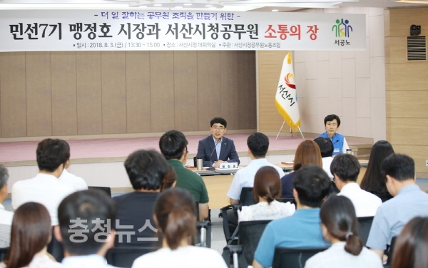 맹정호 서산시장과 서산시청공무원노동조합(위원장 김선복)은 지난 3일 서산시청 대회의실에서 7급 이하 직원들과 더 일 잘하는 공무원 조직을 만들기 위한 소통의 장을 마련했다.
