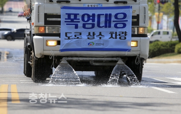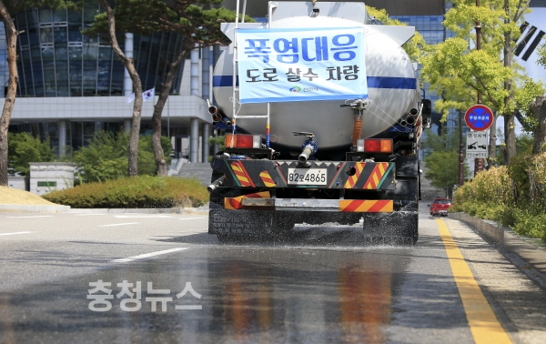 특히 시는 미세먼지 제거를 위해 살수차를 활용하고 있는 가운데 도심열섬화 예방과 도로 온도를 낮추기 위해 긴급으로 살수차량을 9대 투입해 오후 2시부터 5시까지 하루 2회 도로에 살수 작업을 펼치고 있다.