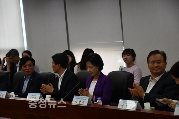 추미애 더불어민주당 대표, 이상민·조승래 의원이 7일 오전 연구개발특구에서 '과학기술을 통한 혁신성장 및 일자리 창출' 간담회를 열고 과학기술기반 고급 일자리 창출에 대해 논의했다.