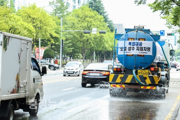 금성백조가 지원하는 살수 차량은 8일부터 11일까지 대전 서구 둔산동, 탄방동, 용문동 지역과 동구 신흥동, 효동, 중구 문창동, 선화동 일대에 오전 10시부터 16시까지 작업을 진행한다.