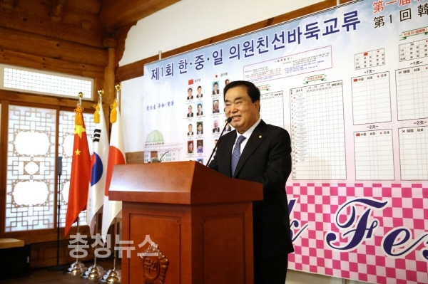 문 의장은 개막식 축사를 통해 “한·중·일 세 나라의 의원들이 바둑교류를 함께 한 것은 처음 있는 일”이라고 환영의 인사를 전한 후, “바둑은 조화와 타협의 미학을 지닌 도(道)·예(藝)·기(技)가 한데 어우러진 스포츠”라며 바둑의 철학을 공유하는 3국간의 지속적인 상호 교류를 강조했다.