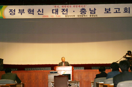 ‘정부혁신 대전·충남 보고회’가 엑스포 국제회의장에서 7일 오후 오영교 행자부장관을 비롯해 염홍철 대전시장과 심대평 충남도지사, 정부혁신 관계기관  자치단체장 등 300여명의 관계자가 참석한 가운데 개최됐다.