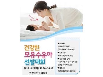 충남 아산시보건소(소장 김은태)는 오는 28일 아산터미널웨딩홀에서 ‘2018년 건강한 모유수유아 선발대회’(이하 대회)를 실시한다고 밝혔다.