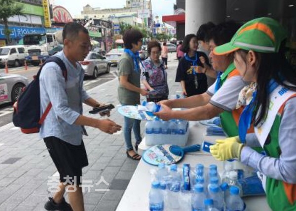 조치원읍사무소, 조치원역 등 관계 기관과 자율방재단 20여명이 함께 얼음생수와 쿨스카프, 홍보용 부채, 각 1,500개를 시민들에게 배부했다.