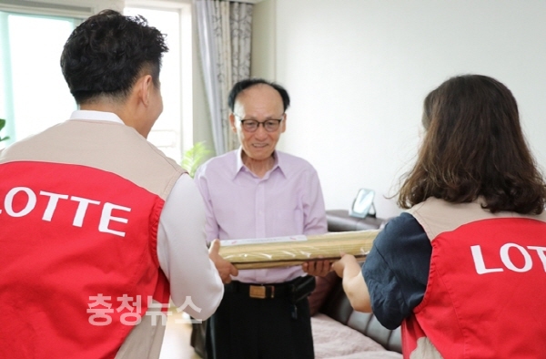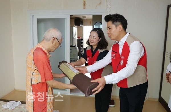 롯데백화점 대전점 샤롯데봉사단은 올해 유례없는 폭염으로 인해 더운 여름을 보내고 있는 고령 독거 국가유공자 및 보훈가족에게 대나무 돗자리를 직접 전달하고 혹서기 위문을 실시했다.