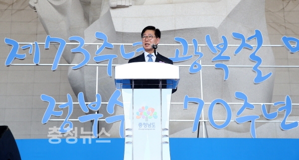 양 지사는 15일 천안 독립기념관에서 열린 ‘제73주년 광복절 및 정부수립 70주년 경축식’에 참석, 경축사를 통해 "수많은 애국지사를 배출한 3·1운동의 성지인 충남에 건립함으로써 진정한 의미의 광복으로 나아가기 위한 새로운 가치와 동력을 충남이 앞장서 준비하겠다"는 의지를 내비쳤다.