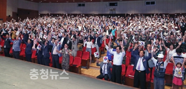 당진문예의전당 대공연장에서 진행된 경축행사에는 김홍장 시장과 김기재 시의회 의장을 비롯한 기관단체장과 광복회원, 보훈단체 회원, 학생과 시민 등 600여 명이 참석한 가운데 엄숙한 분위기 속에서 진행됐다.