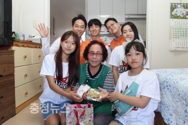 챔피언팀과 한화갤러리아타임월드 임직원이 월평동 거주 어르신께 직접 만든 선물세트를 전달하고 있다.