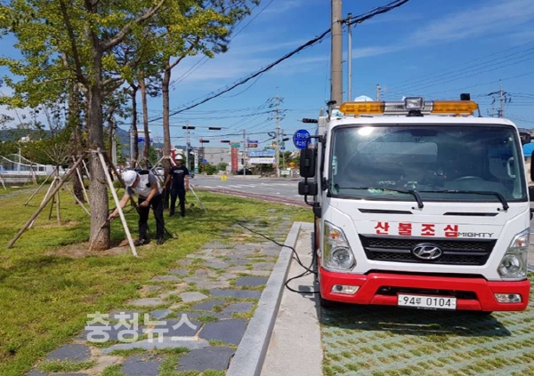 충남 홍성군은 지속되는 폭염 및 가뭄에 대비해 관내 주요도로변 가로수와 공원 등 수목에 대하여 생육환경에 지장이 없도록 물주기에 행정력을 집중하고 있다.