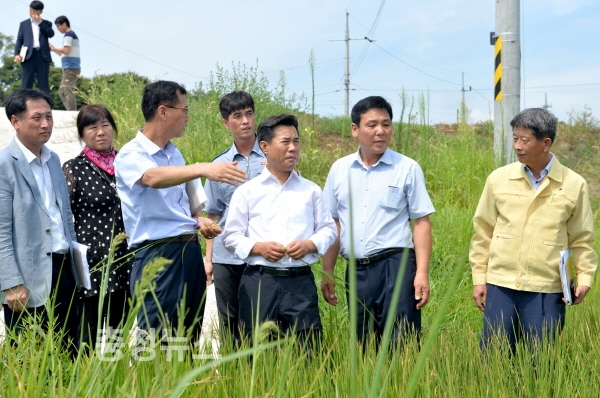 이어 벼농사를 짓고 있는 구룡면 농가를 찾아 상황을 살폈다. 가뭄으로 인해 물대기가 어려워 벼가 시들고 고사가 나타나 용수 공급이 절실했다.