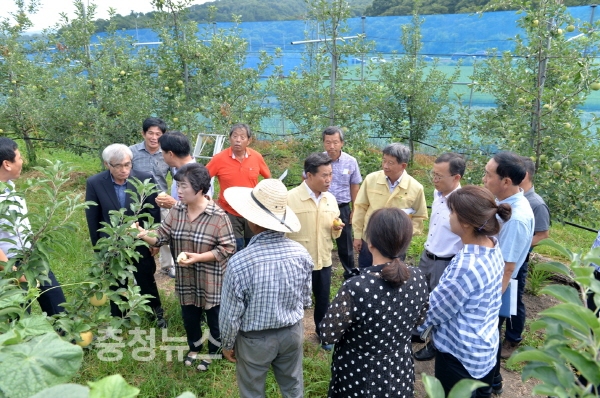 먼저 박 군수와 부여군의원들은 가뭄으로 인해 수분 공급이 줄어 과실 표면 온도가 높아져 나타나는 일소과(日燒果, 햇볕데임) 피해를 입은 내산면 사과농가를 방문해 농민의 이야기를 들었다.