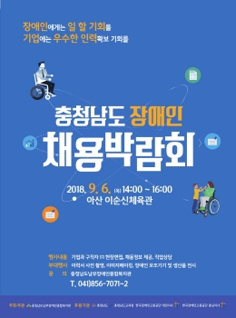 충청남도남부장애인종합복지관(관장 백낙흥)이 주최하는『2018 충청남도장애인채용박람회』가 다음달 6일 아산 이순신체육관에서 구인업체 및 장애인직업재활시설 등 총 50여개 기관이 참여한 가운데 ‘장애인에게는 일할 기회를, 기업에는 우수인력 확보 기회를’이라는 캐치프레이즈로 개최된다.