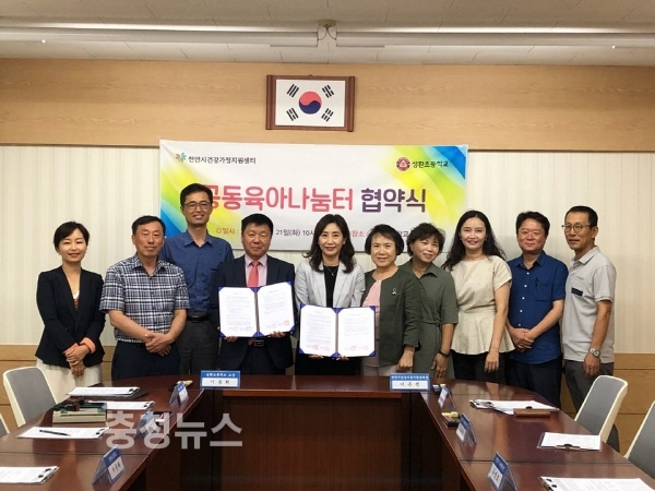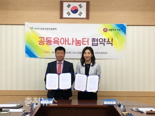 충남 천안시가 위탁·운영하는 천안시건강가정지원센터(센터장 이은정)가 21일 성환초등학교(교장 이동희)와 공동육아나눔터 업무협약을 체결했다.